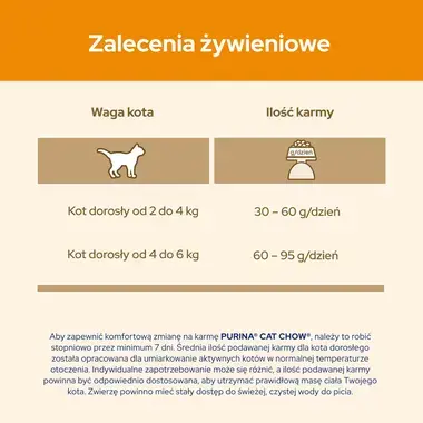 Cat Chow Adult to sucha karma dla kotów, która zawiera wszystkie składniki odżywcze niezbędne do tego, by Twój kot mógł prowadzić aktywne dorosłe życie. Pokarm zawiera witaminę E, aby wspomagać naturalną odporność kota oraz witaminy z grupy B, aby pomóc mu efektywnie wykorzystywać energię. Dzięki wyselekcjonowanym źródłom białka karma Cat Chow Adult dodatkowo pomaga budować sline mięśnie kotów.