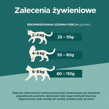 Podane normy ilości karmy dla kotów sterylizowanych odnoszą się do zwierząt umiarkowanie aktywnych w normalnej temperaturze otoczenia. Indywidualne potrzeby mogą się różnić, a ilość podawanej karmy powinna być odpowiednio dostosowana, aby utrzymać szczupłą sylwetkę i prawidłową masę ciała Twojego kota. Pamiętaj, aby zawsze zostawić miskę świeżej i czystej wody do jego dyspozycji. Woda ułatwia usuwanie zbędnych produktów przemiany materii z organizmu. Nakłanianie Twojego kota do picia pomoże ograniczyć formowanie się kamieni nerkowych. Wprowadzaj PURINA ONE® DualNature® stopniowo przez 7 dni.