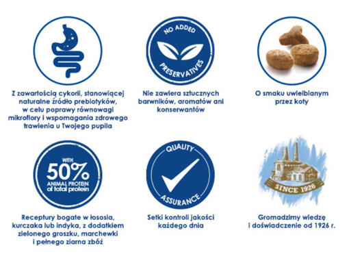 Poznaj dobroczynne właściwości naszych pysznych, zbilansowanych produktów o zawartości wysokiej jakości białka zwierzęcego na poziomie 50% (w całkowitej zwartości białka) oraz z naturalnym prebiotykiem, który pomaga poprawić trawienie.