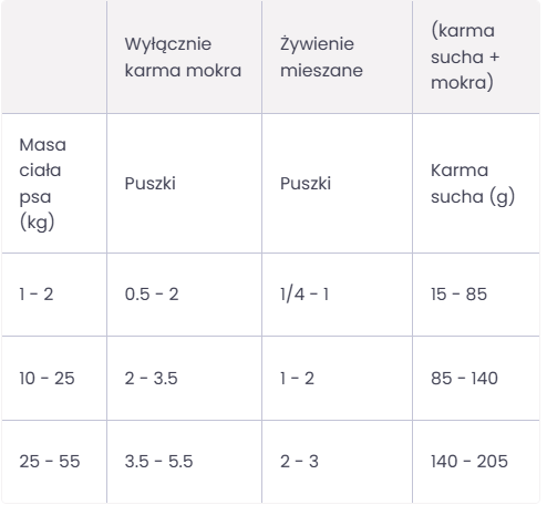 Podane ilości karmy odnoszą się do psów umiarkowanie aktywnych w normalnej temperaturze otoczenia. Indywidualne potrzeby różnią się, a ilość podawanej karmy powinna zostać dostosowana tak, aby utrzymać prawidłową, szczupłą sylwetkę Twojego psa. Zwierzę powinno mieć stały dostęp do czystej, świeżej wody do picia.